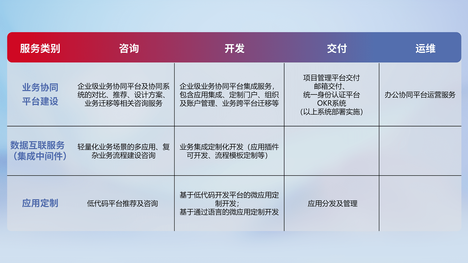针对钉钉、、、、企微、、、IDaas等平台级产品提供产品的规划、、、方案、、交付、、定制化开发等服务,,,,实现如统一协同办公、、、智能客户服务、、混合会议管理、、智能数据查询、、等业务场景,,,实现数字化转型。。。。